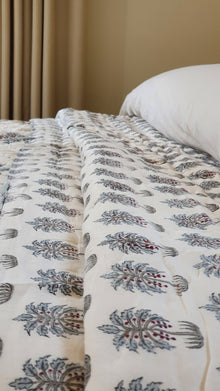 The Palm & Pine Quilt will uplift the beauty of any bedroom. While grey palm and pine motifs adorn one side of the quilt, tiny palm trees fill the other. Fine layer of printed cotton hold between them hand-fluffed carded cotton, that provides cosy warmth in the colder months and that not so heavy feel in the summer months.